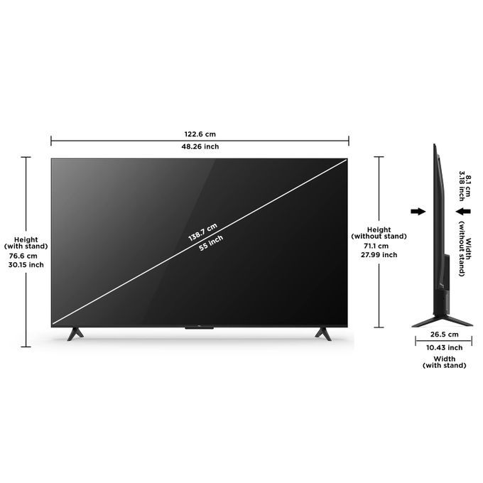 Type de produit : TV LED Série P635 Type LED UHD Google TV Design Type de cadre EDGELESS DESIGN Type de montage Mural et sur pied Courbure de l'écran Plat Couleur avant Noir Couleur du support Noir Dimension & Poids Dimension de l'écran 55 pouce Dimensions (L / P / H) CM 1400×135×875 / 122,6 * 8,,1 * 76,6 Caractéristique générale Technologie d'affichage DLED Resolution 4K UHD 3840×2160 Couleur Noir Poids(Kg) 8,5/6,3 Classe énergétique Temps de réponse 9,5 ms Taux de rafraîchissement (Hz) 60 Tension 220- 240 Fréquence Hz 50/60 CPU/GPU/RAM/ROM A55×4 1.3GHz / G31x2 800MHz / DDR3-2133: 2G Bytes / Service connecté Système d’exploitation Android R Navigateur web Google Galerie Applications disponibles PRIME VIDEO, Google Play, Youtube, Featured Apps, Source, etc. Connectivity HDMI 3 USB 1 *2.0 Ethernet (LAN) Ethernet Network (RJ45, 10/100M) Sortie audio numérique (optique) WiFi 2.4GHz Wi-Fi 802.11 b/g/n 2T2R Bluetooth Bluetooth 5.1 Audio Audio Bluetooth Oui Technologie Sortie sonore (RMS) Haut-parleur DOLBY AUDIO Fonctionnalités supplémentaires E-SHARE HDR Smart HDR Eco-fonctionnalités Capteur Eco Oui Accessoire Cordon Oui Manuel D'utilisation Oui Télécommande Oui DOMAINES D'UTILISATION Chambre, Salon, salle d'attente... La garantie ne prend pas en charge les réparations sur l'écran